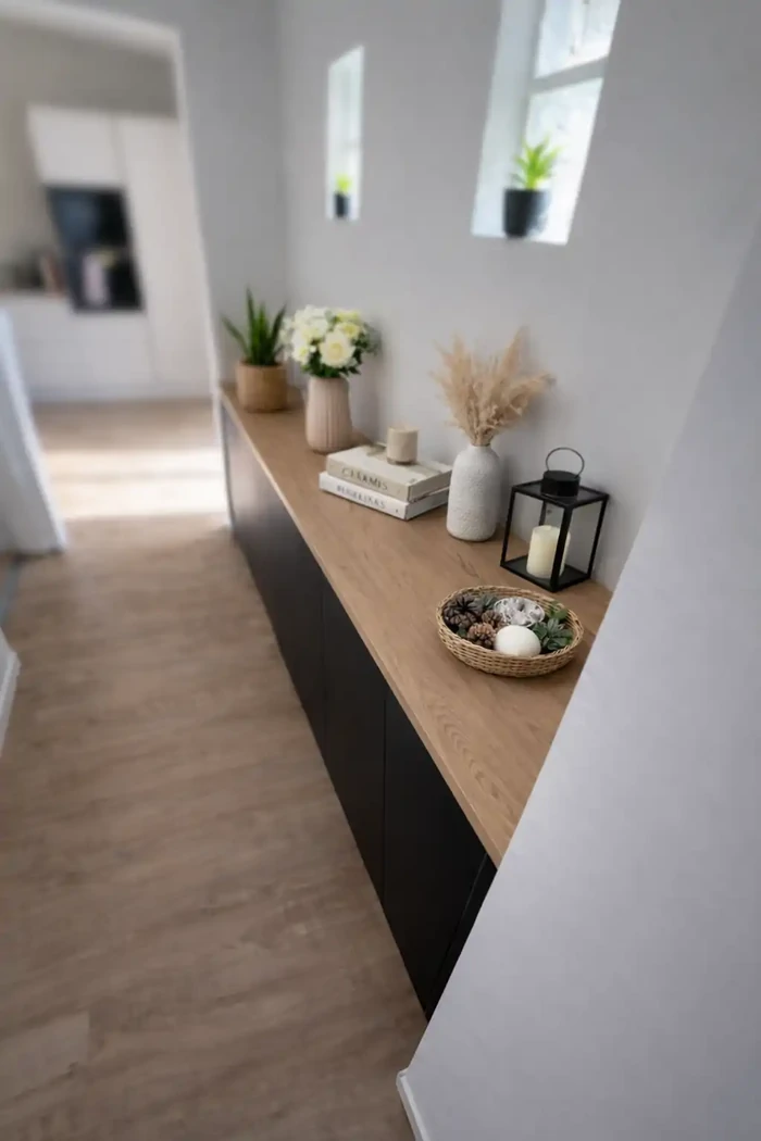 Nous avons dessiné et fabriqué ce meuble parfaitement intégré dans un espace de passage, alliant esthétique et fonctionnalité.